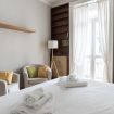 Grazioso bilocale situato nella zona di Piazza Piola, a poca distanza dal Politecnico. Si trova al 2° piano, servito da ascensore, con un ballatoio che offre uno spazio di proprietà, completo di tavolino e sedie per pranzi all'aperto. Il bilocale è caratterizzato da un ingresso con cucina a vista dotata di un tavolo da pranzo per 4 persone. La zona giorno, ampia e luminosa, ospita un confortevole divano letto. La zona notte dispone di un letto matrimoniale e di un bagno completo.